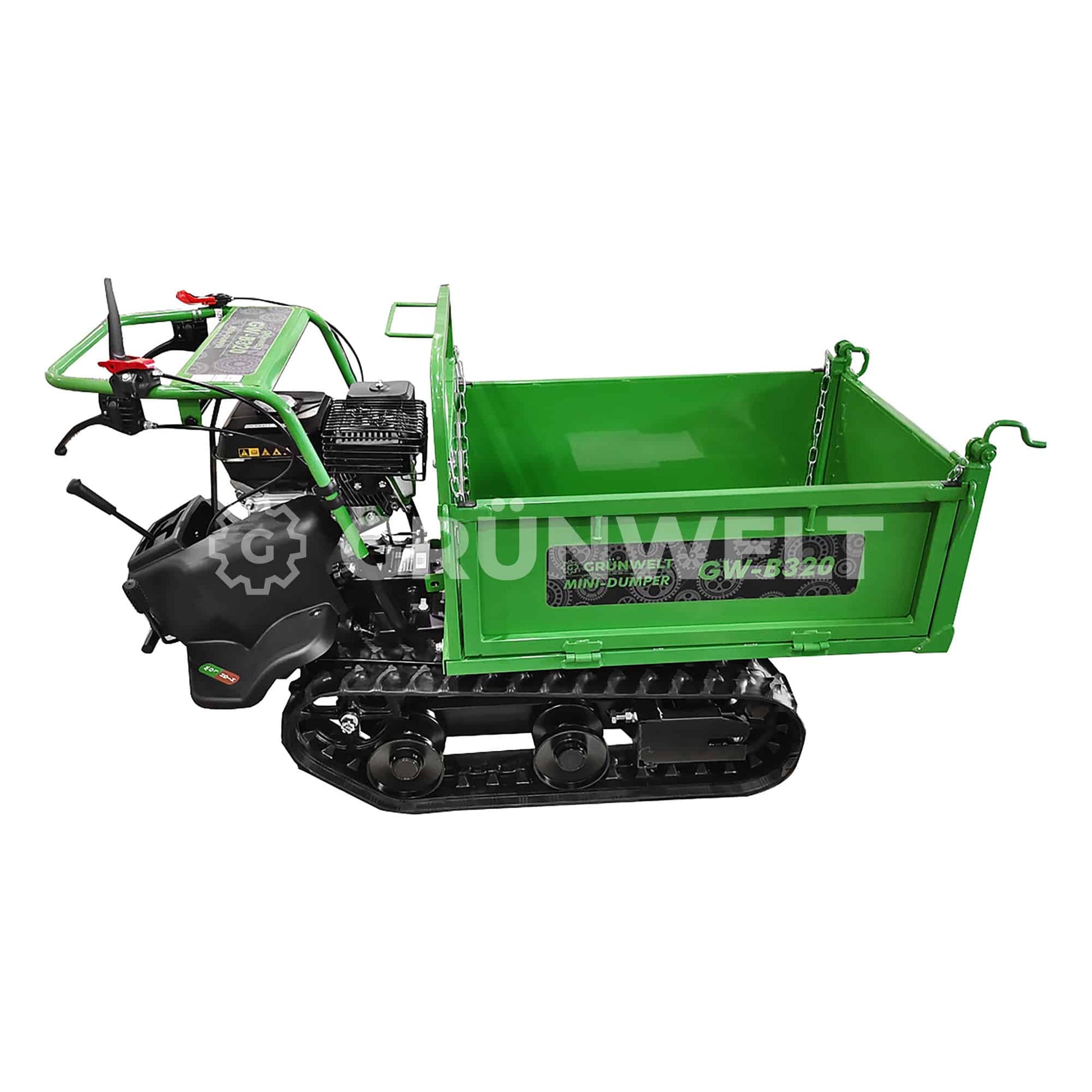 Sand? Gartenabfälle? Schüttgut? – Kein Problem! Mini-Raupendumper Grünwelt GW-B320 wird Ihnen das Leben erleichtern. Grünwelt GW-B320 ist eine universelle Einheit, die für den Transport von verschiedenen Lasten jeder Form und Größe verwendet wird, mit einem Gewicht von bis zu 320 kg. Das Gerät ist mit einem Benzinmotor Grünwelt GW170F/P ausgestattet, der einen zuverlässigen und effizienten Betrieb gewährleistet. Die Riemenkupplung macht die Konstruktion einfach zu warten und das Sechsganggetriebe erleichtert die Auswahl der optimalen Geschwindigkeit für den Betrieb. Die Ladefläche kann durch das Öffnen der Seiten vergrößert werden. Grünwelt GW-B320 zeichnet sich durch seine Wendigkeit und hohe Produktivität aus und der Kippbehälter vereinfacht den Entladevorgang erheblich. Der Raupendumper wird ihr Helfer im Garten, im Gewächshaus, im Bauernhof oder auf der Baustelle sein.