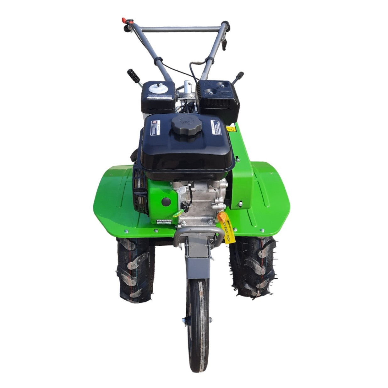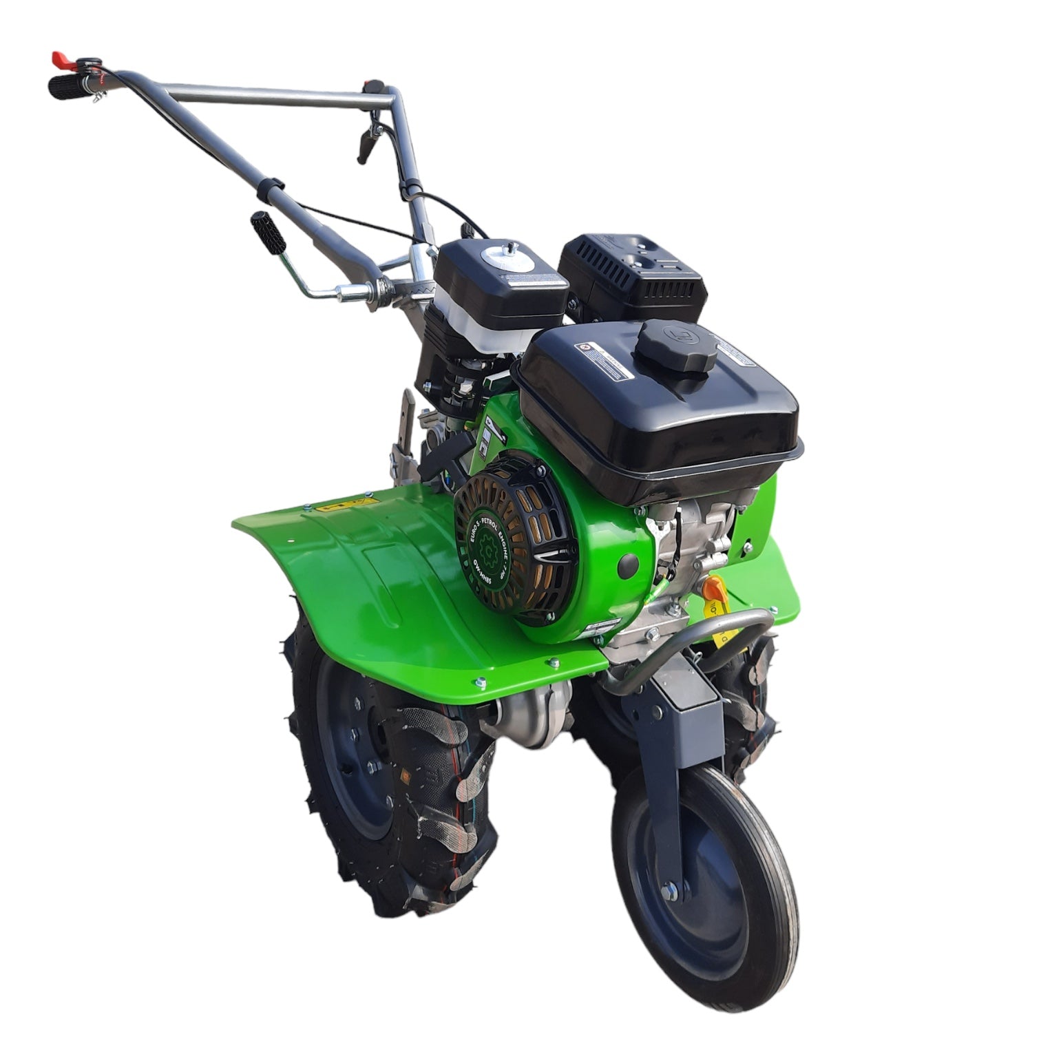 Die neue Motorhacke GW-MH85 von Grünwelt präsentiert sich als benutzerfreundliches Gerät mit einem bemerkenswert niedrigen Gewicht im Vergleich zu anderen Motorhacken seiner Klasse . Unsere neue Motorhacke ist eine ideale Wahl f ür landwirtschaftliche Tätigkeiten auf Flächen von bis zu 40 Aren oder für die Verarbeitung zwischen den Reihen in viel größeren Territorien dank ihrer zweistufigen Reduzierung , die sich auch bei Transportaufgaben bewährt. Im Lieferumfang enthalten sind vier Zinken mit einer Arbeitsbreite bis zu 80 cm , die bis zu einer Tiefe von 30 cm verwendet werden können, was eine präzise und effiziente Bodenbearbeitung ermöglicht. Die Grünwelt GW-MH85 kann wahlweise mit kleinen Schaufelrädern arbeiten, die in den Mittelgang untergebracht sind, sowie die großen, sich auf zwei nebeneinander bewegen. Wenn auf der Motorhacke die Schaufelräder montiert sind, besteht die Möglichkeit, verschiedene Anbaugeräte wie Pflüge, Häufelpflüge, Kartoffelpflüge, Schälpflüge, Kartoffellegemaschinen und Anhänger anzubringen . Dies macht die neue GW-MH85 zu einer äußerst vielseitigen Lösung für Ihre landwirtschaftliche Anwendungen. Zusätzlich ist die Motorhacke mit einem höhenverstellbaren und seitlich drehbaren Lenkrad ausgerüstet, was die ergonomische Anpassung an unterschiedliche Nutzerpräferenzen ermöglicht. Die Motorhacke Grünwelt GW-MH85 ist mit dem Grünwelt GW210F Benzinmotor mit 7 PS ausgestattet , der aufgrund seiner hervorragenden Funktionalität und Leistung einen guten Ruf genießt. Sein Hauptunterschied ist der niedrige Kraftstoffverbrauch und die Tatsache, dass er keine Angst vor längerem Betrieb bei hohen Drehzahlen hat. Die robuste Bauweise und der zuverlässige Riemenantrieb schützen den Motor vor Überlastung, insbesondere auf anspruchsvollem Gelände. Das Getriebe hat drei -Geschwindigkeiten: 2-Vorwärts und 1-Rückwärts . Die Motorhacke von Grünwelt wird entleert geliefert. Man braucht weiterhin für das Grundgerät 0.95 – 1.1 L Getriebeöl (SAE 80w-90) und 0.6 – 0.7 L Motoröl (SAE 10w-30 oder 10w-40).