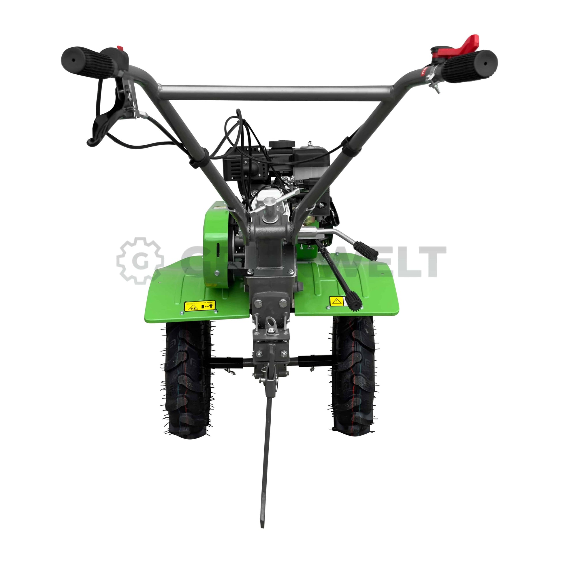 Motorhacke Grünwelt GW-MH95 - ist eine gute Variante für die Realisierung aller möglichen landwirtschaftlichen Arbeiten. Und dank der starken Gusseisengetriebe und Universalmessers, die sowohl auf 3 als auch auf 4 Messern gestapelt werden können , ist die Motorhacke GW-MH95 von Grünwelt auch ein Helfer im Gartenbau - der Messerkörper hat keine Angst vor Messerschlägen auf die Wurzeln. Außerdem ist dieser Motorhacke mit einem Lenkrad ausgerüstet, das in der Höhe justierbar ist. Von allen ähnlichen Motorhacken ist der Grünwelt GW-MH95 dank seiner untertriebenen Motorhalterung die ausgewogenste in seiner Klasse, die es ermöglicht, mit geringem Aufwand zu arbeiten. Der wichtigste Vorteil dieses Modells ist jedoch die Möglichkeit, verschiedene Anbaugeräte über einen Riemenantrieb unter einem Standardriemen (B-Profil) zu verwenden . Dieses Modell zeichnet sich durch hohe Verarbeitungsqualität, Multifunktionalität und Zuverlässigkeit aus und, vor allem, hat ein neues Getriebe mit nicht 2, wie zuvor, sondern mit 3 Vorwärtsgängen . Der dritte Gang wurde speziell für ein komfortableres Arbeiten mit den Kreiselmähern mit leichten Getriebegehäusen und anderen aktiven Anbaugeräten hinzugefügt, da die agronomische Geschwindigkeit des Kreiselmähers 2-4 km/h beträgt. Außerdem wurde die Rückwärtsgangdrehzahl von 65 auf 50 U/min nach EU Sicherheitsanforderungen reduziert. Die Motorhacke von Grünwelt wird entleert geliefert. Man braucht weiterhin für das Grundgerät 1.2 – 1.3 L Getriebeöl (SAE 80w-90) und 0.6 – 0.7 L Motoröl (SAE 10w-30 oder 10w-40).