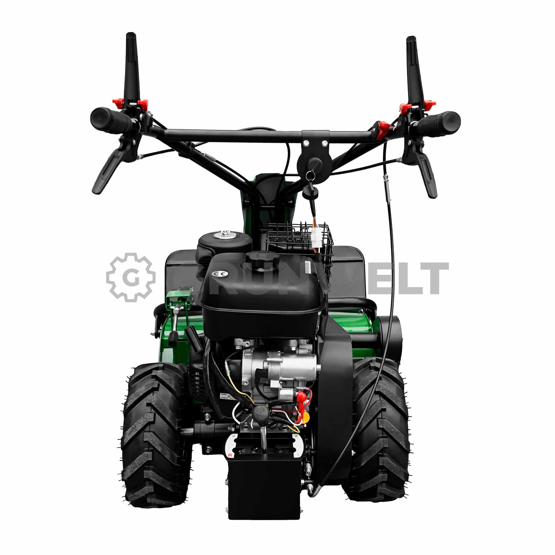 Der Grünwelt GW-X700E ist ein leistungsstarker Schlegelmulcher für mittlere und große Grundstücke. Die Schnittbreite des Schlegelmähers Grünwelt GW-X700E beträgt 700 mm und die Schnitthöhe ist ab 5 bis 50 mm einstellbar . Dies eignet sich dieses Modell ideal zum Mähen und Mulchen von Unkraut, hohem Gras, kleinen Büschen, Pflanzenstängeln usw. Das System aus 36 Y-Schlegelmesser mit beidseitigem Schleifen auf der Welle sorgt für eine perfekte Zerkleinerung von Pflanzenrückständen. Dieses Modell verfügt auch die Lenkradhöhenverstellung . Darüber hinaus erleichtert das neue Getriebe mit Gangschaltung von 3-Vorwärts- und 1-Rückwärtsgängen das Manövrieren des Mulchers und sorgt für komfortables Arbeiten in engen Bereichen. Die Zuverlässigkeit dieses Mechanismus wird durch einen Riemenantrieb mit Doppelriemen gewährleistet. Schlegelmulcher Grünwelt GW-X700E ist mit dem zuverlässigen und effizienten Benzinmotor mit einer Leistung von 11 PS ausgestattet. Der Hauptunterschied dieses Motors ist der niedrige Kraftstoffverbrauch und die Tatsache, dass er keine Angst vor längerem Betrieb bei hohen Drehzahlen hat, was Ihnen in Kombination mit einem Kraftstofftank mit dem Kraftstoffvolume von 6 L Geld und Zeit deutlich spart! Für einen vereinfachten Start hat Grünwelt GW-X700E einen Elektrostarter. Grünwelt GW-X700E ist dank seiner 6.50-8 ″ gro ßen R äder sehr bequem zu bedienen. Die R äder werden unaufgepumpt geliefert. Vor dem ersten Gebrauch müssen die Räder daher aufgepumpt werden , andernfalls kann dies zu Schäden führen, die nicht durch die Garantie abgedeckt sind. Zudem hat der Wiesenmulcher zwei Stützräder , dadurch Sie ihn ohne zusätzliche Belastung steuern können. Unser Schlegelmulcher Grünwelt GW-X700E ist das perfekte Gerät, um organische Abfälle effektiv zu verarbeiten und gleichzeitig Komfort und Sicherheit während der Arbeit zu gewährleisten. Der Schlegelmulcher von Grünwelt wird entleert geliefert. Man braucht weiterhin für das Gerät 1.8 – 2.0 L Getriebeöl (SAE 80w-90) und 1.1 – 1.2 L Motoröl (SAE 10w-30 oder 10w-40).