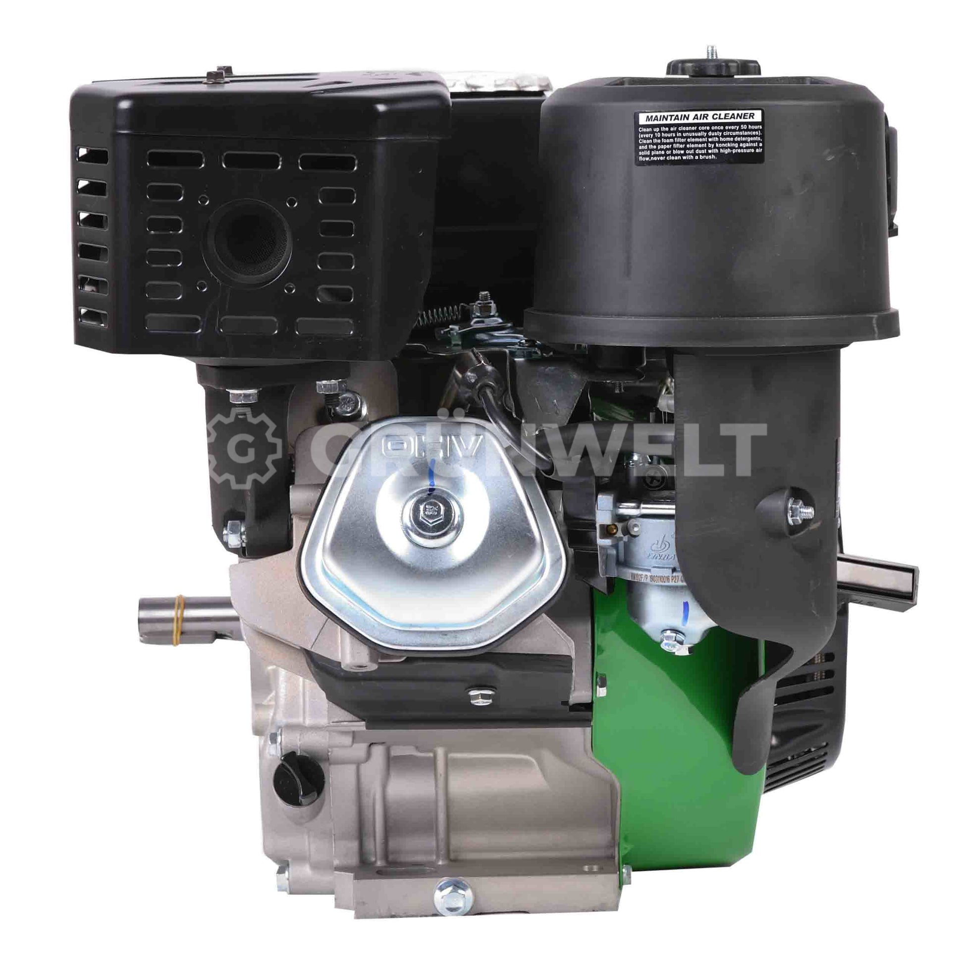 Der Grünwelt GW460E Motor ist ein Einzylinder-Viertaktmotor, der mit Benzin betrieben wird und mit Luftkühlung ausgestattet ist. Der Motor hat die Leistung in Höhe von 18 PS und verbraucht 374 g/kWh des Kraftstoffes. Dank seines Tanks von 6.5 Litern kann der Motor ungefähr 1.5 Stunden ohne zu tanken arbeiten. Der neue GW460E Motor von Grünwelt ist wartungsfreundlich und zuverlässig in der Anwendung. Er hat einen niedrigen Pegel von Rauch und Lärm und Sie können den einfach und problemlos bei jedem Wetter dank seines Elektrostarters starten. Das Anwendungsspektrum beschränkt sich nicht ausschließlich auf den industriellen Bereich. Dieses Modell des Motors kann auf den Geräten im Alltag und in der Landwirtschaft installiert werden. Der Motor Grünwelt GW460E wird häufig als Austauschmotor für verschiedene Motorhacken, Balkenmäher, Einachser, Rüttelplatten, Mini-Dumper, Wasserpumpen, Stromerzeuger und viele andere Geräten mit dem Benzinmotor verwendet. Der Schaft der Kurbelwelle ist genormt. Der Motor Grünwelt GW460E kann als Austauschmotor bei gleichem Kurbelwellenmaß verwendet werden. Die Kurbelwelle des Motors hat direkten Ausgang unter die Passfedernut. Der Motor ist nicht nur zuverlässig, sondern auch umweltfreundlich! Das Gerät erfüllt alle Voraussetzungen der Abgasnormen nach EURO 5.