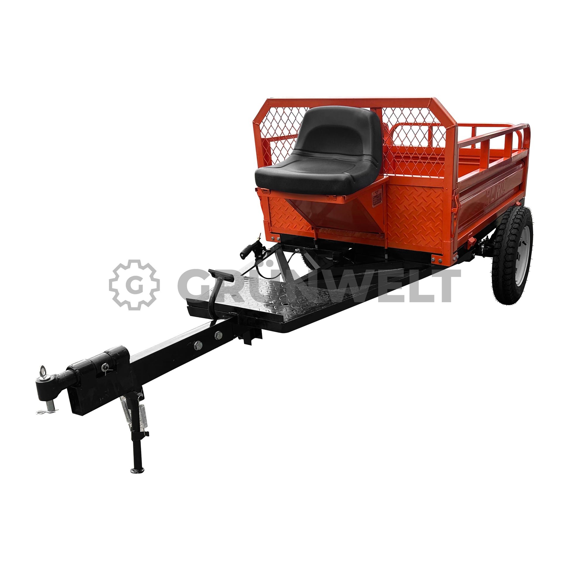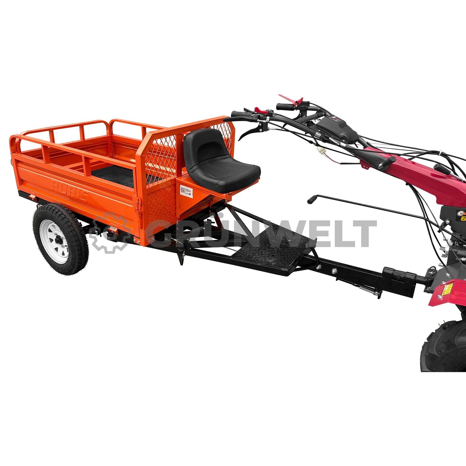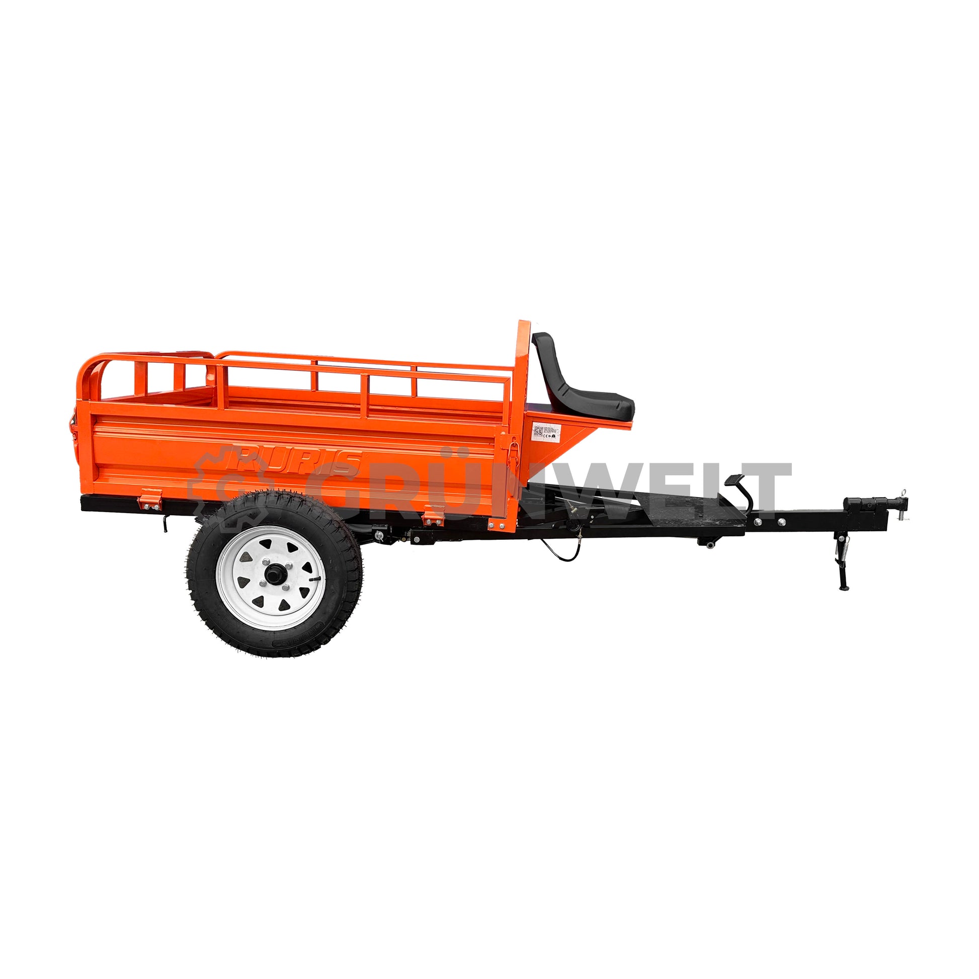 Unser neuer RURIS 550S ist ein funktionaler und zuverlässiger Transportanhänger, der speziell für den Einsatz in der Landwirtschaft entwickelt wurde. Ideal für den Transport von Saatgut, Erntegut und anderen landwirtschaftlichen Materialien, überzeugt er durch seine robuste Konstruktion und sein verstärktes Fahrgestell, das selbst unter schwierigen Geländebedingungen zuverlässig arbeitet. Der Anhänger ist mit einem Hand- und Fußbremssystem sowie einem Kippmechanismus ausgestattet, der das Entladen deutlich erleichtert. Der auf Scharnieren gelagerte Rahmen ermöglicht die Kippfunktion, was die Vielseitigkeit des Anhängers im täglichen Arbeitseinsatz erheblich erhöht. Ein abschließbares Staufach unter dem Sitz bietet Platz für Werkzeuge oder Zubehör, während die integrierten Lammellenfedern für verbesserten Fahrkomfort auf unebenem Gelände sorgen. Hinweis: Der Anhänger ist nicht für den Einsatz im öffentlichen Straßenverkehr zugelassen und darf nicht auf Hängen über 10° Neigung verwendet werden.