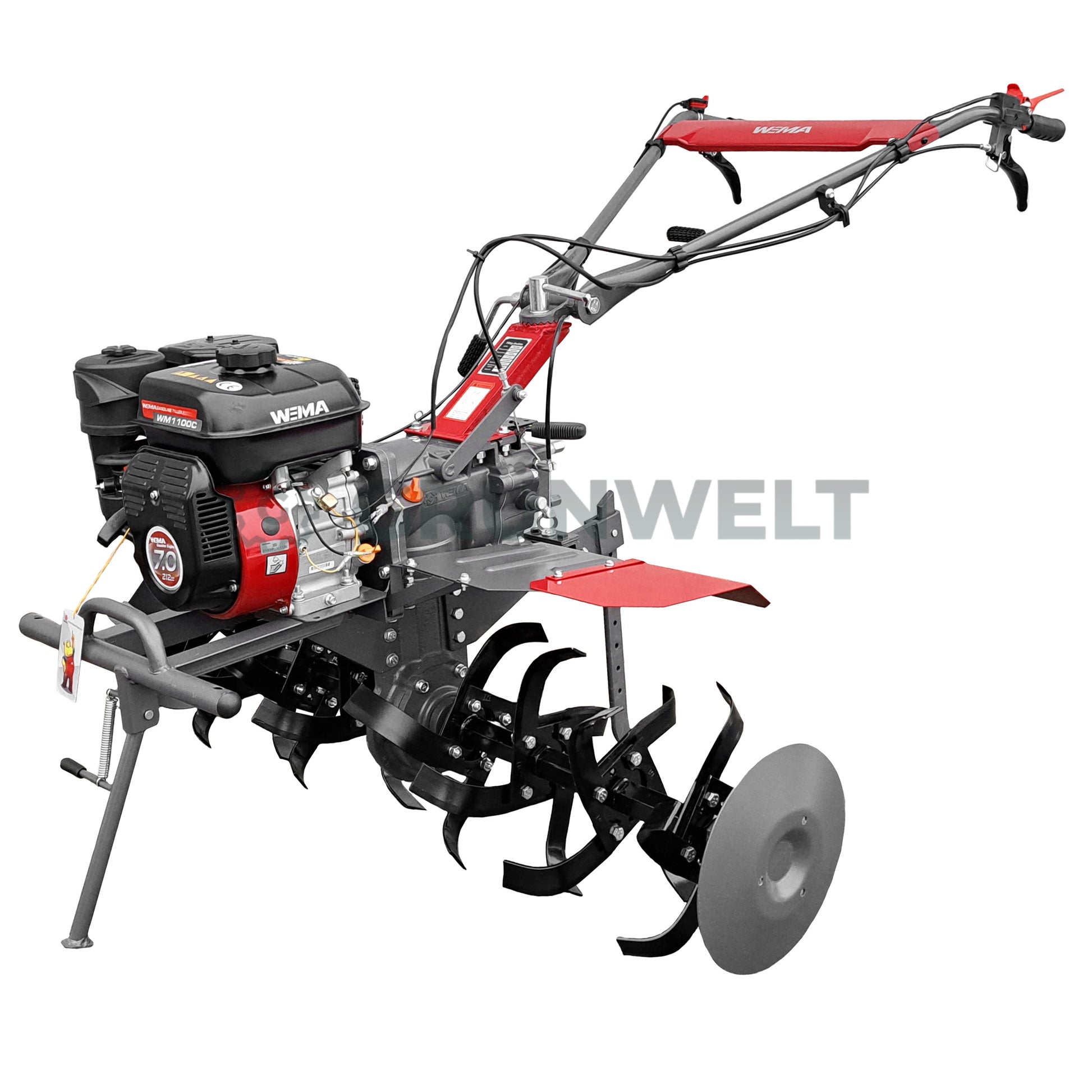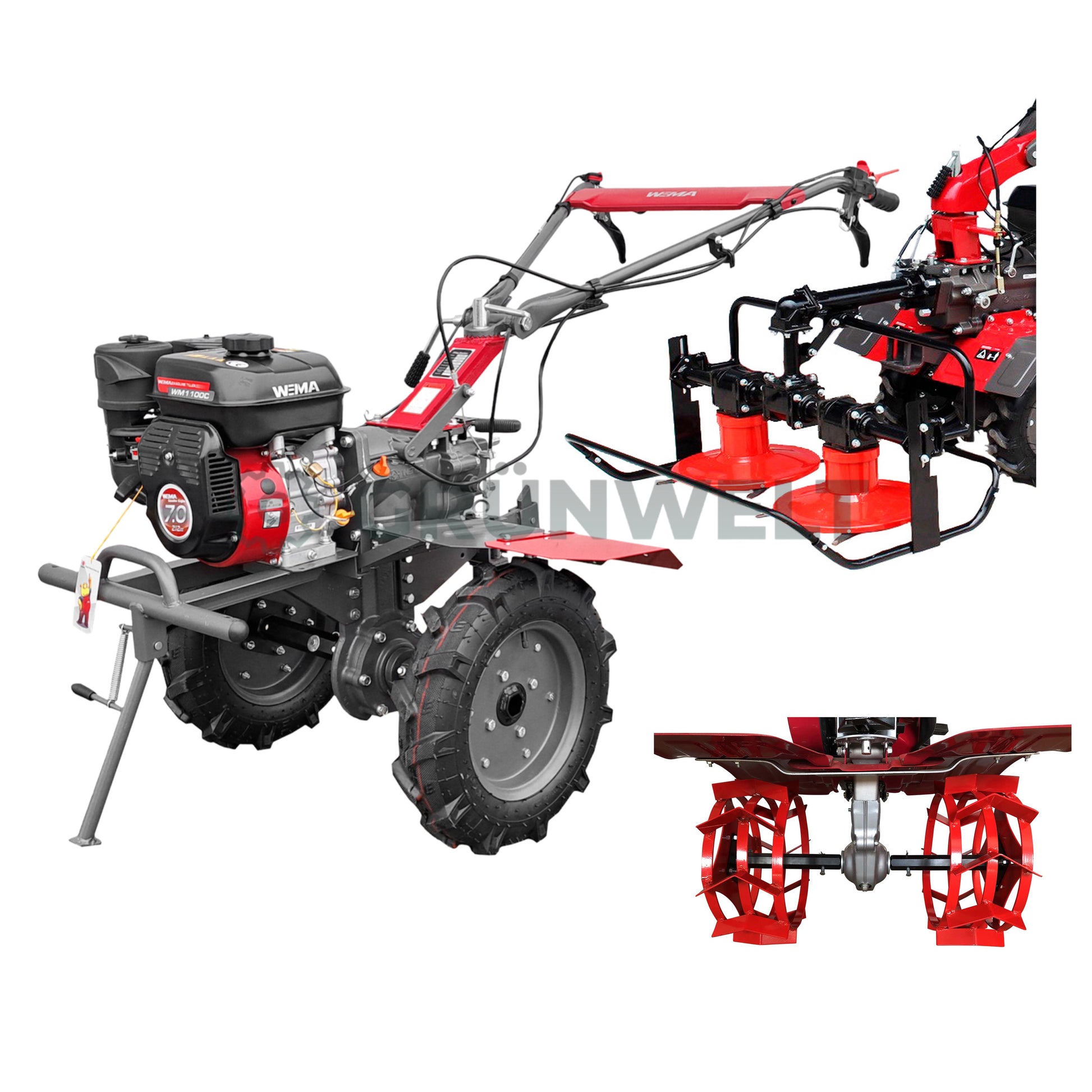 Motorhacke Weima WM1100C-6 Motorhacke Weima WM1100C-6 ist mit den Fräsen (2+1+1) mit einer Arbeitsbreite von 110 cm ausgestattet und kann mit einer Vielzahl von Anbaugeräten arbeiten, einschließlich der Kreiselmäher. Darüber hinaus kann das Mähen zum Ernten von Heu mit einem Transportwagen durchgeführt werden.