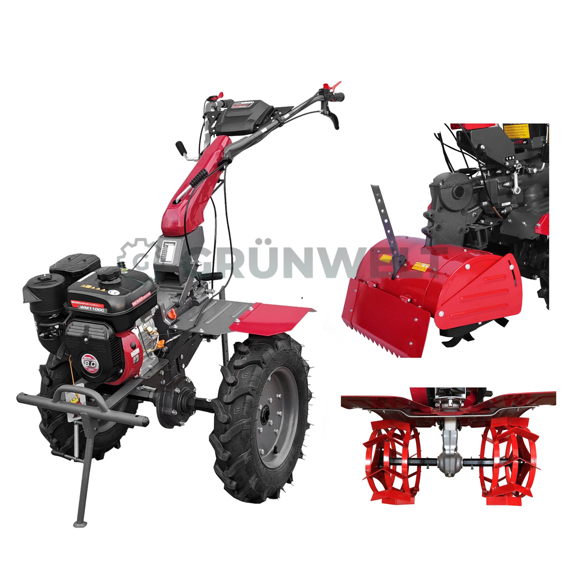 Weima WM1100C-6 Deluxe Motorhacke Weima WM1100C-6 Deluxe ist mit den Fräsen (2+1+1) mit einer Arbeitsbreite von 110 cm ausgestattet und kann mit einer Vielzahl von Anbaugeräten arbeiten, einschließlich der Kreiselmäher. Darüber hinaus kann das Mähen zum Ernten von Heu mit einem Transportwagen durchgeführt werden.